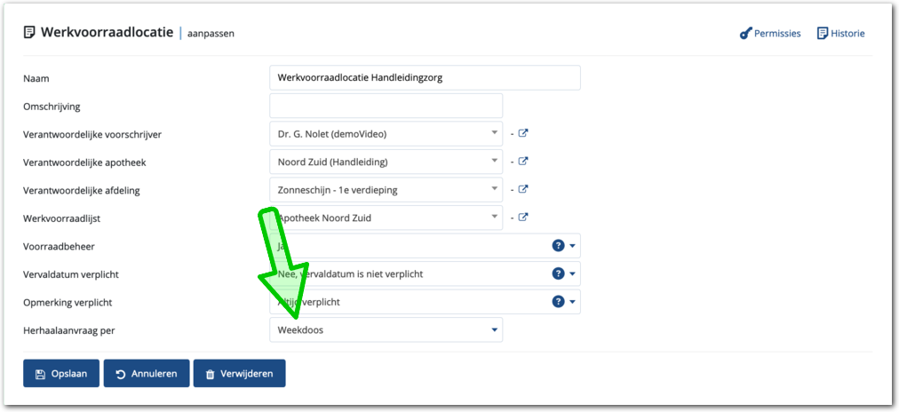Bij het doen van een bestelling voor de werkvoorraad werd voorheen voor de standaard leverdatum gekeken naar de configuratie van de verantwoordelijke afdeling. In sommige gevallen zou men onderscheid willen maken tussen een standaard leverdatum voor reguliere bestellingen en een standaard leverdatum voor werkvoorraadbestellingen waarvoor die afdeling toevallig ook verantwoordelijk is. In deze versie kunt u bij Onderhoud > Entiteiten beheren > Werkvoorraad beheren, instellen of de standaard leverdatum per vandaag, morgen of weeklevering moet gebeuren. De huidige configuratie van de verantwoordelijke afdeling wordt gemigreerd naar deze nieuwe configuratie.