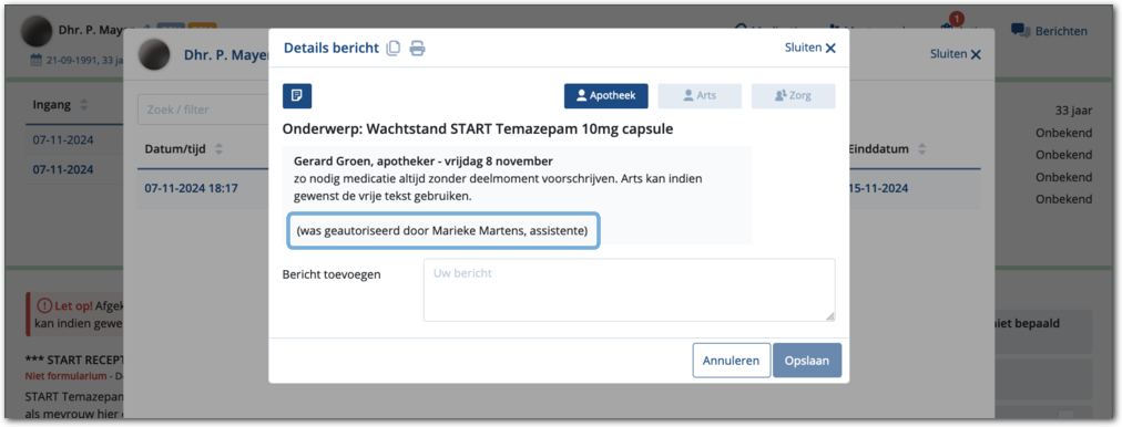 Bij het digitaal nakijken van medicatieopdrachten in Medimo kan de apotheker een medicatieopdracht die al geautoriseerd is, afkeuren en daarmee terugzetten naar te-autoriseren. Wanneer in tweede instantie de medicatieopdracht door iemand anders werd geautoriseerd, was het niet meer na te gaan wie de medicatieopdracht in eerste instantie had goedgekeurd. Vanaf deze versie wordt de informatie over wie de medicatieopdracht heeft geautoriseerd, toegevoegd aan het bericht dat wordt aangemaakt bij de afkeuring. Hierdoor blijft deze informatie inzichtelijk, zelfs als dit vaker wordt uitgevoerd.