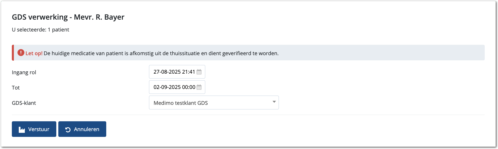 Let op! De actie Verifieer thuismedicatie is niet blokkerend voor het maken van een GDS-opdracht voor de cliënt. Maak daarom werkafspraken over hoe hiermee om te gaan.