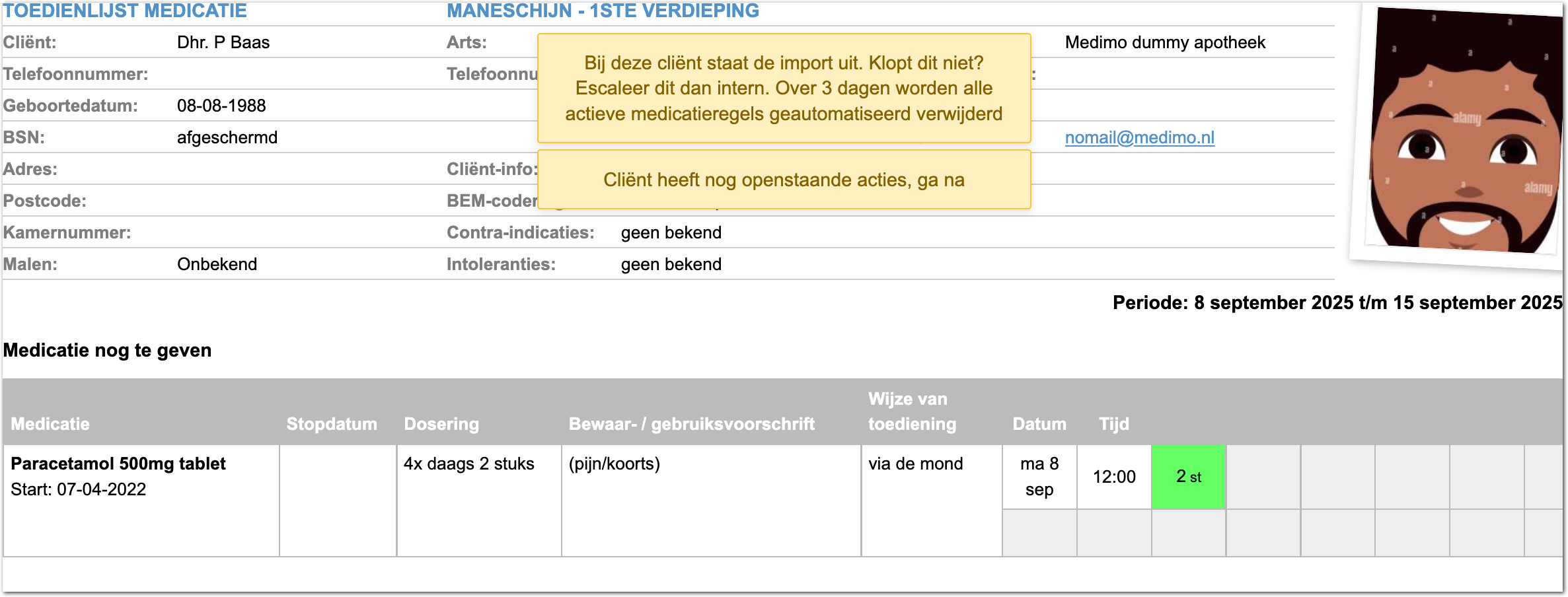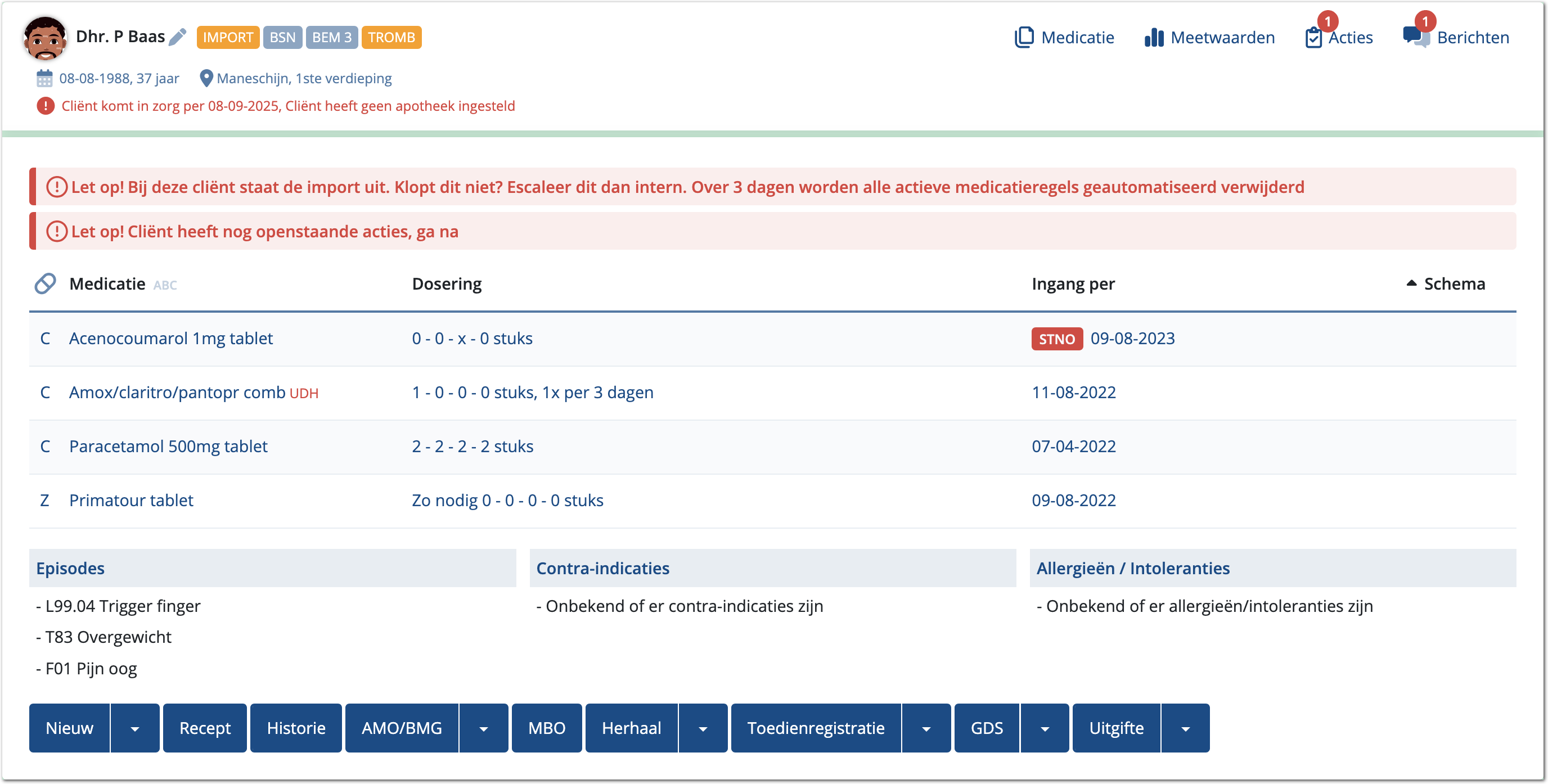 Als de import bij een cliënt (nog) is uitgeschakeld, de actie intake medicatie-import nog openstaat terwijl er actieve medicatie aanwezig is, wordt deze medicatie na 72 uur automatisch gestopt. Om gebruikers tijdig op deze situatie te attenderen, wordt in de status en op de toedienregistratie een duidelijke waarschuwing getoond. Hiervoor geldt het volgende: