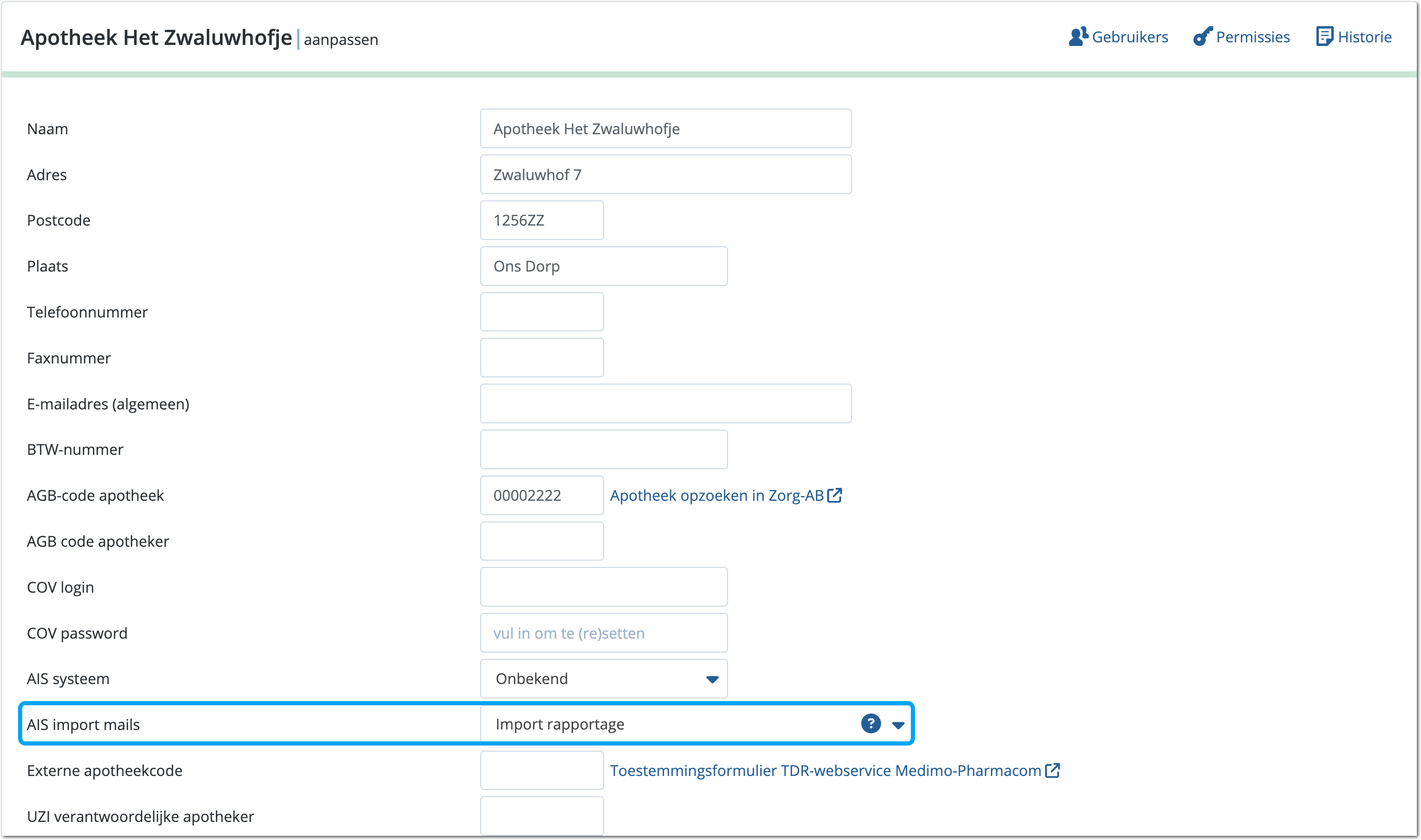 Dit configureert u bij de apotheek entiteit onder de optie AIS import mails.