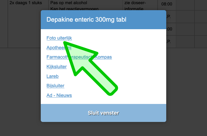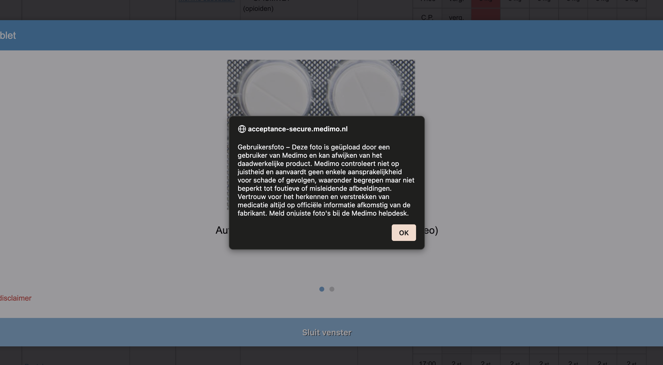 Medimo biedt al geruime tijd de mogelijkheid om afbeeldingen van geneesmiddelen toe te voegen. Deze afbeeldingen zijn direct vanuit de toedienregistratie te raadplegen. In de toedienregistratie kunt u klikken op de naam van het geneesmiddel voor extra informatie. Er worden dan in een pop-up links weergegeven van onder andere apotheek.nl. Ook is daar een link opgenomen om het uiterlijk van het geneesmiddel te bekijken. In de onderstaande afbeelding wordt daarvan een voorbeeld getoond.