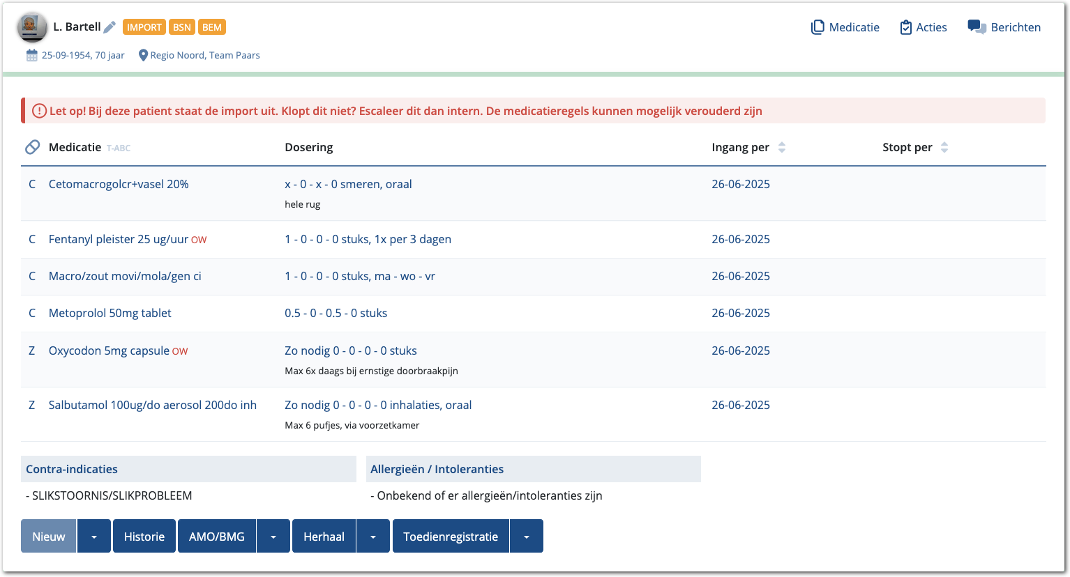 Staat de import uit en is er géén openstaande actie intake medicatie-import, dan wordt de actieve medicatie niet gestopt. Wel wordt gewaarschuwd dat de import uit staat en de medicatie mogelijk verouderd is. De afbeelding hieronder toont daarvan een voorbeeld.
