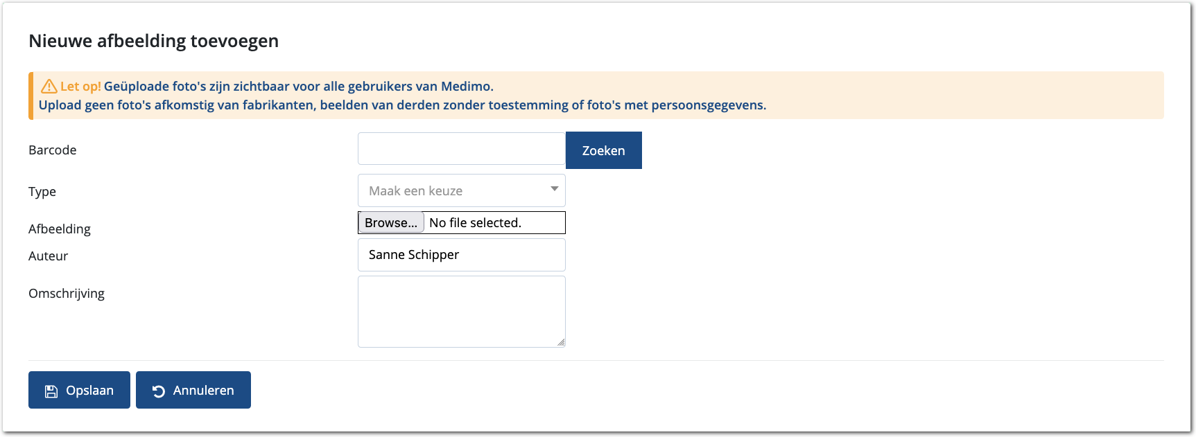 De toegevoegde afbeeldingen worden opgenomen in een landelijke lijst en zijn daardoor voor álle Medimo-gebruikers beschikbaar. Deze landelijke beschikbaarheid is echter niet altijd duidelijk voor gebruikers die de afbeeldingen toevoegen of bekijken. Om gebruikers hierop te attenderen, zijn de volgende aanpassingen doorgevoerd: