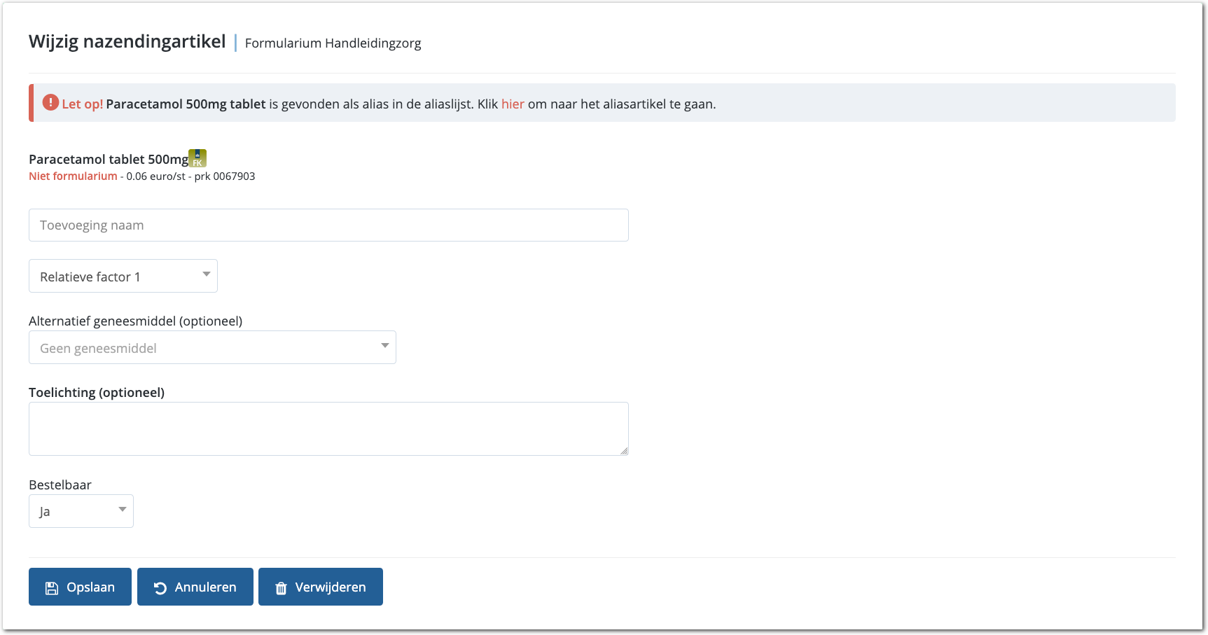 Wanneer medicatie op nazending staat en tevens als alias is opgenomen in de Aliaslijst, kan het voorkomen dat de apotheek de alias wil aanpassen. Om deze reden wordt bij dergelijke medicatie een waarschuwing getoond in de geneesmiddellijst Nazending. Tevens is een directe link toegevoegd naar het aliasartikel, zodat de apotheek de alias direct kan aanpassen. In de afbeelding hieronder ziet u daarvan een voorbeeld.