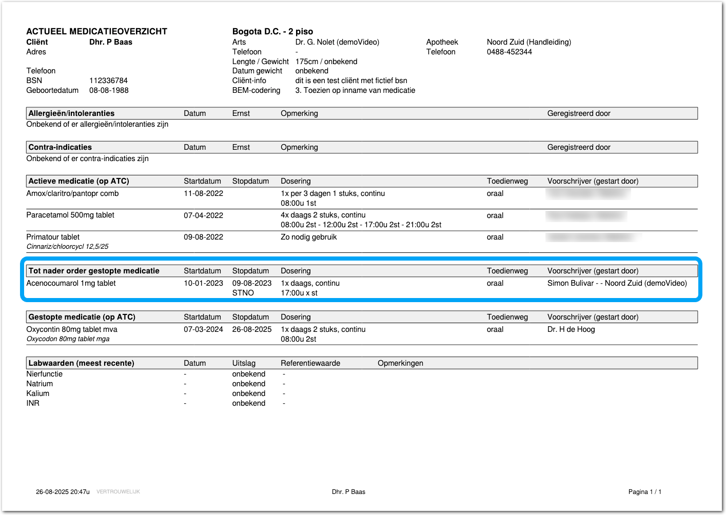 Om een duidelijker onderscheid te maken tussen definitief gestopte medicatie en tijdelijk gestopte (STNO) medicatie, wordt vanaf deze versie de STNO-medicatie op de AMO onder een aparte kop vermeld. In de afbeelding hieronder ziet u daarvan een voorbeeld. Hierin de STNO-medicatie omlijnd.