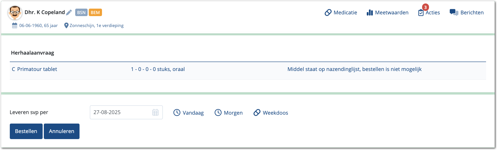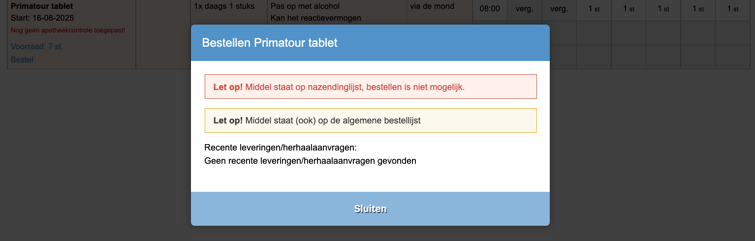 Klik hieronder op de tabbladen voor voorbeelden van weergave bij medicatie die geblokkeerd is voor bestellen.