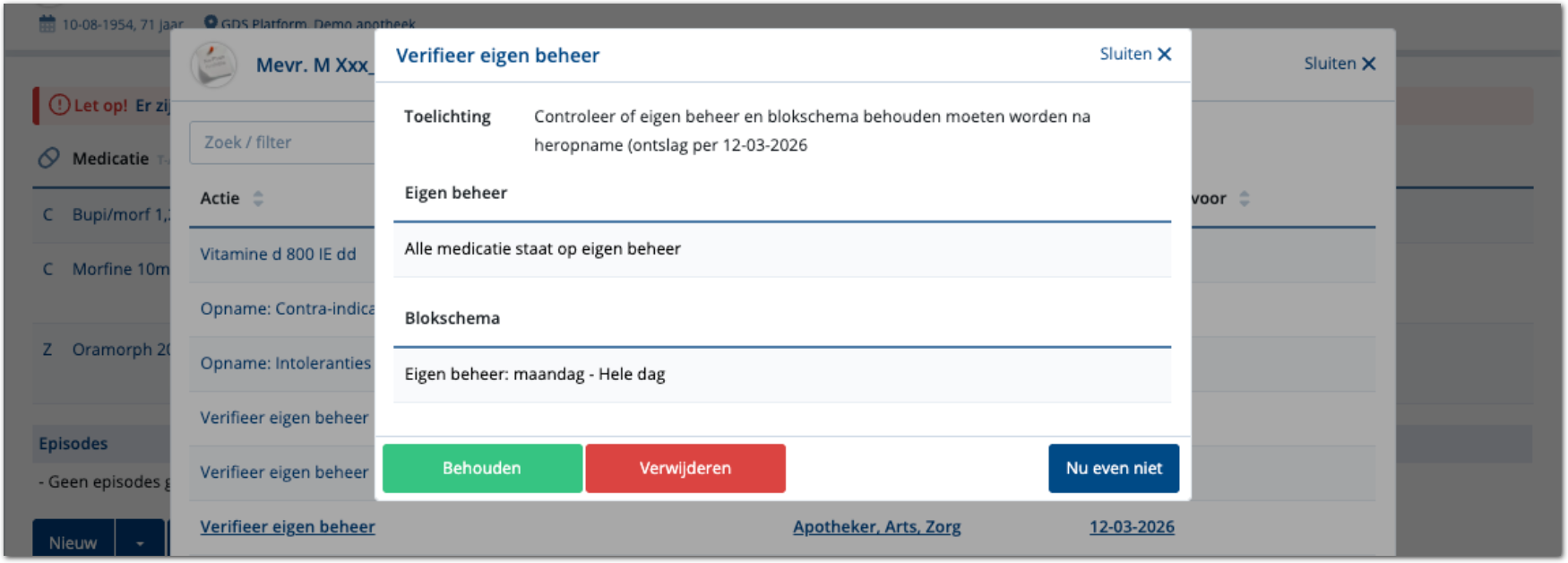 Met verwijderen wordt het eigen beheer en alle blokschema's verwijderd, ook de schema's met een andere toediening dan eigen beheer (bijvoorbeeld de toediening Buiten zorg).