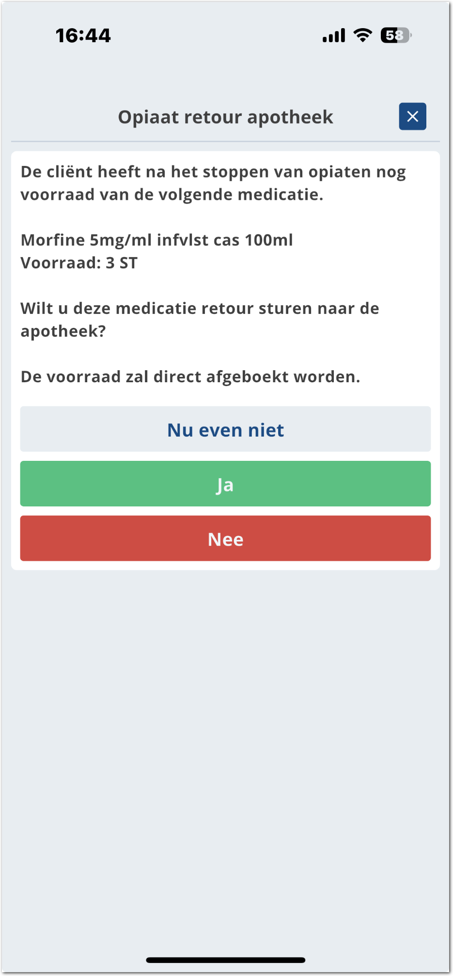 Vanaf versie 2025-4 is in de Medimo webversie instelbaar of de knop Nee wordt getoond bij de actie Opiaat retour apotheek. Deze functionaliteit is in de app vanaf versie 3.8.2 toegevoegd.