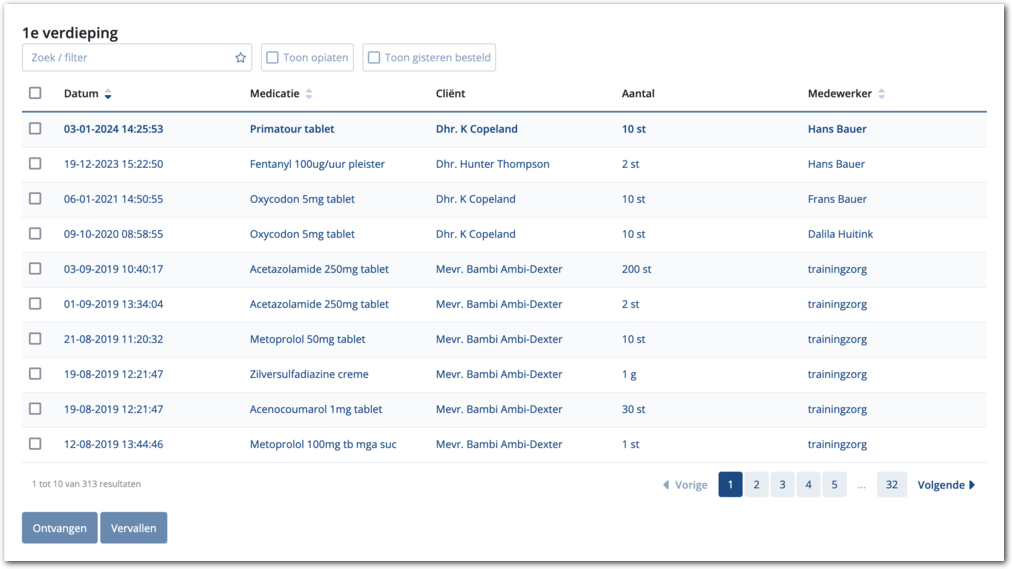 Aan de linkerzijde wordt een 'zoek/filter'-veld getoond. Hiermee kunt u zoeken naar een specifieke bestelling. Rechts worden knoppen getoond voor het toepassen van filters op opiaten en medicatie dat gister is besteld.