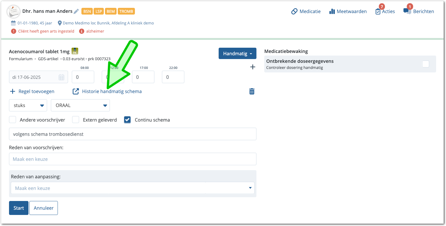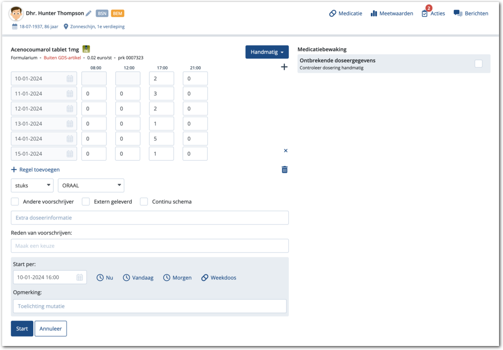 de weergave 'Handmatig' geeft u per dag een tijd een dosering op. Hiermee kunt u bijvoorbeeld de dosering van acenocoumarol invoeren als er geen gebruik wordt gemaakt van een trombosedienst koppeling. De onderstaande afbeelding is een voorbeeld van de weergave 'Handmatig'.
