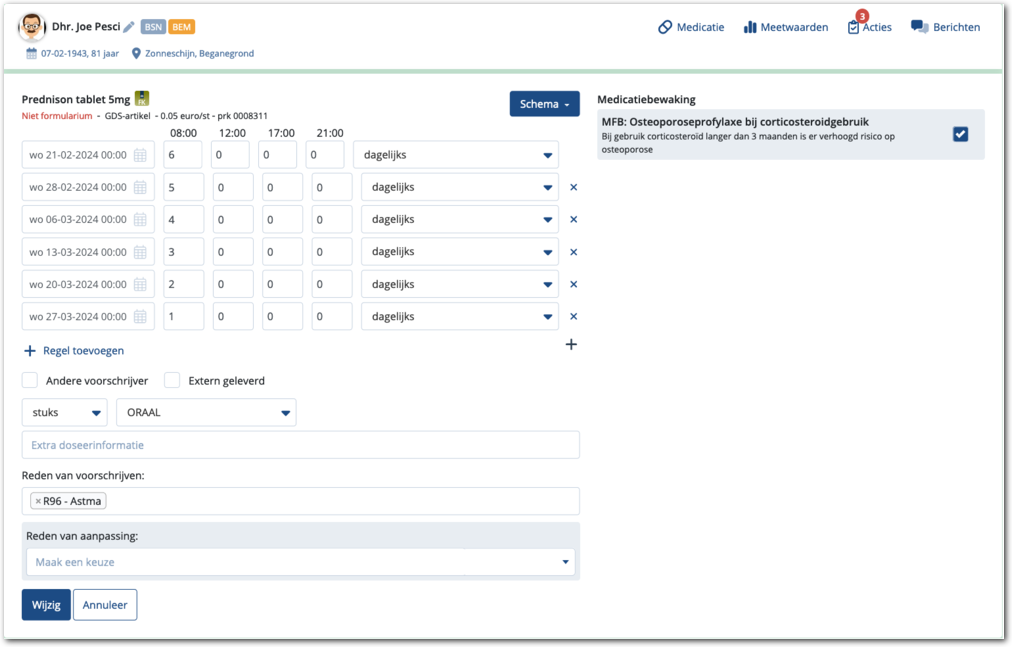 Dit kan in de weergaven 'Uitgebreid' en 'Schema'. Zie onderstaande afbeeldingen. Weergave uitgebreid Weergave Schema Voor het starten en wijzigen van medicatie kunt u artikelen Hoe start ik nieuwe Medicatie en Hoe wijzig ik de medicatie van een ...