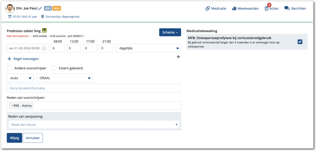 Deze weergave heeft dezelfde functionaliteit als de weergave Regulier, met daarbij: Afwijken van toedientijden Uitbreiding van toedienmomenten Afwijken van toedienweg Voorschrift markeren als 'Andere voorschrijver' Voorschrift markeren als 'Extern ...