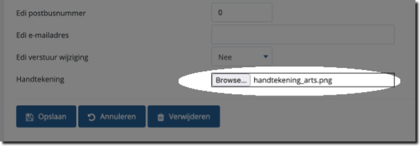 Nadat u de afbeelding heeft geselecteerd toont Medimo de naam van het bestand in het veld achter handtekening zoals belicht in onderstaande afbeelding.