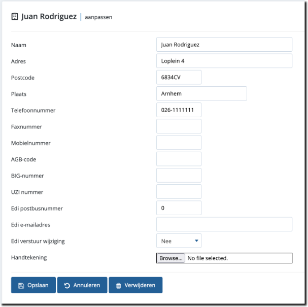 Gebruik het zoeken in alles veld of klik vanuit het hoofdmenu op Onderhoud > Entiteiten > Artsen beheren. Daar toont Medimo een lijst van arts entiteiten. Klik op de arts entiteit waaraan u een handtekening wilt toevoegen. De onderstaande afbeelding is een voorbeeld van een arts entiteit.
