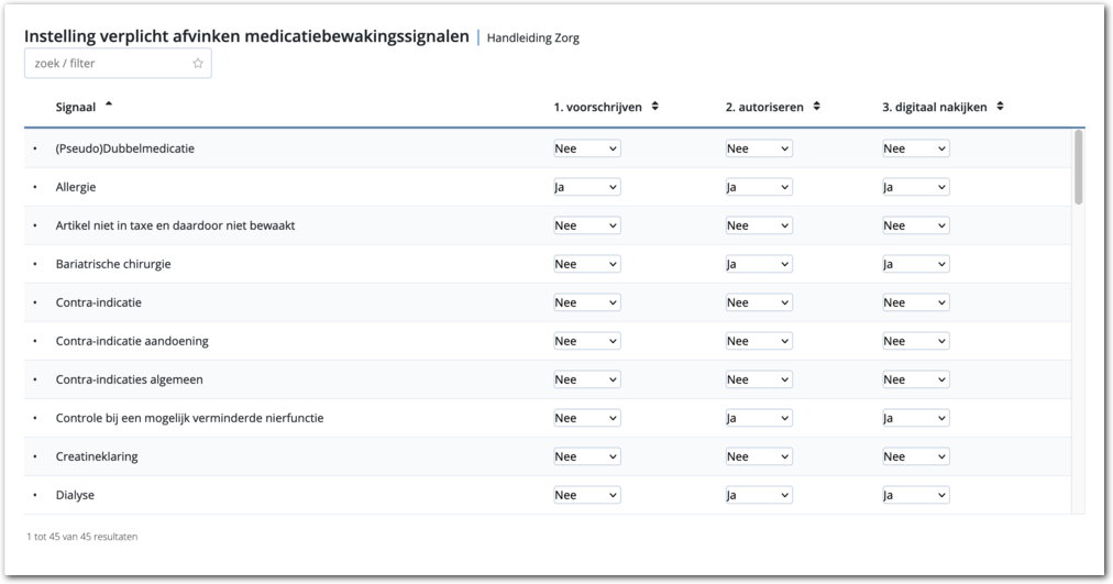 Waar stel ik in welke medicatiebewaking signalen verplicht zijn om af te handelen?