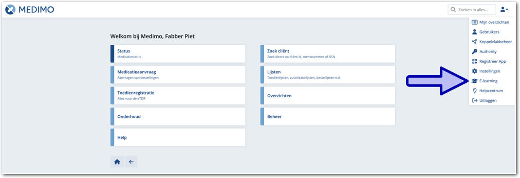 Wanneer er een SSO-koppeling voor de e-learning is gerealiseerd, dan kunt u via het snelmenu navigeren naar de e-learning. Het snelmenu opent u via het silhouet rechtsboven. De onderstaande afbeelding is een voorbeeld van een hoofdmenu waarbij het snelmenu is geopend. De blauwe pijl wijst naar de link voor de e-learning.