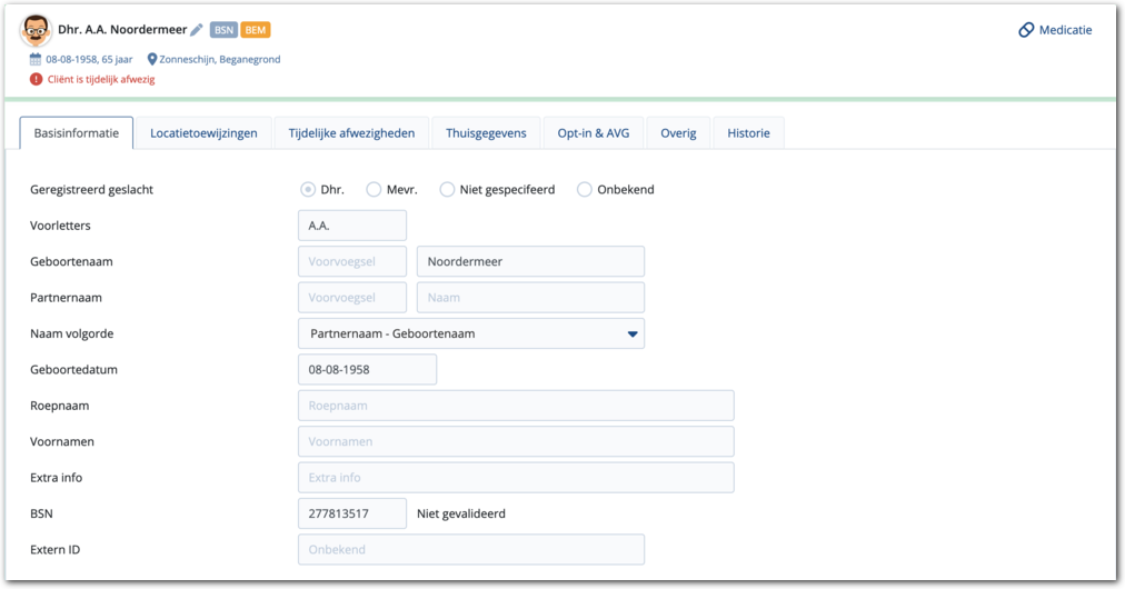 Klik op het potloodje om de niet-medische gegevens te openen. Deze worden getoond in een aantal tabladen. Dit komt overeen met de onderstaande afbeelding.