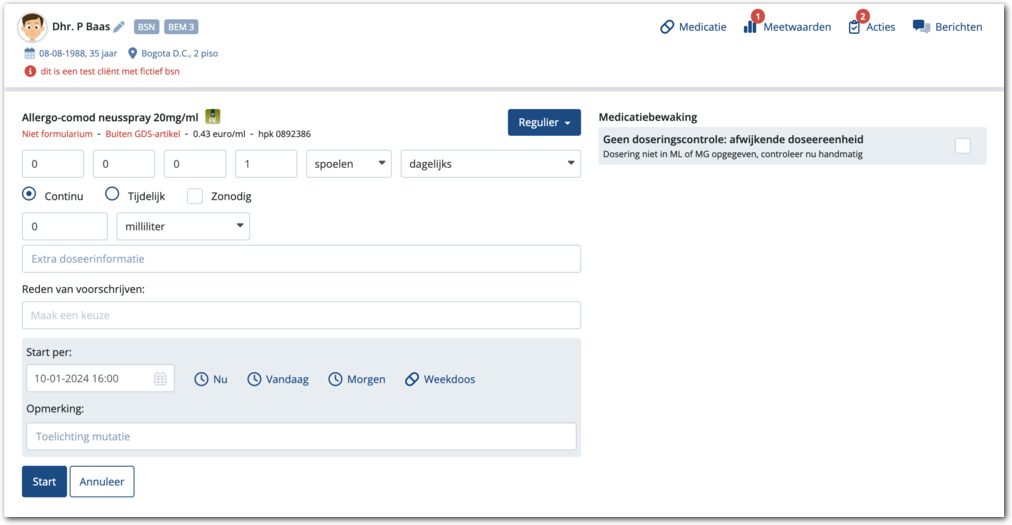 Als er een doseringscontrole bestaat in de G-standaard, maar dat deze niet uitgevoerd kan worden, dan wordt dit signaal getoond. Dit betekent dat de opgegeven doseereenheid niet overeen komt met de doseereenheid van de doseringscontrole uit de G-standaard. U dient in dat geval handmatig de dosering te controleren.