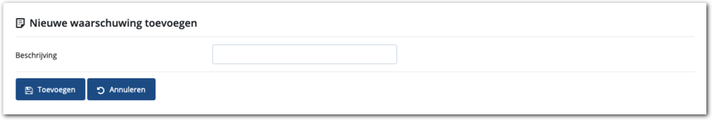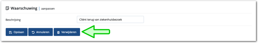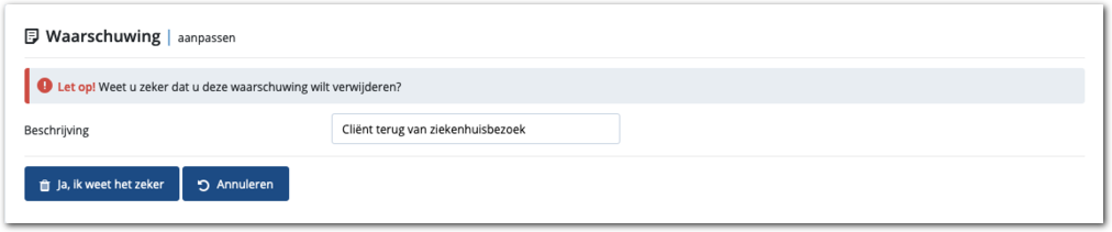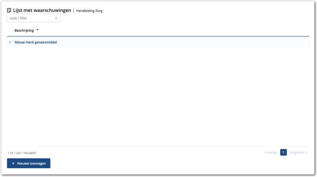 Hierna is de bestaande waarschuwing aangepast met de nieuwe beschrijving en toont Medimo de lijst met waarschuwingen. Alle waarschuwingen die waren toegevoegd aan cliënten worden automatisch aangepast naar de nieuwe beschrijving.
