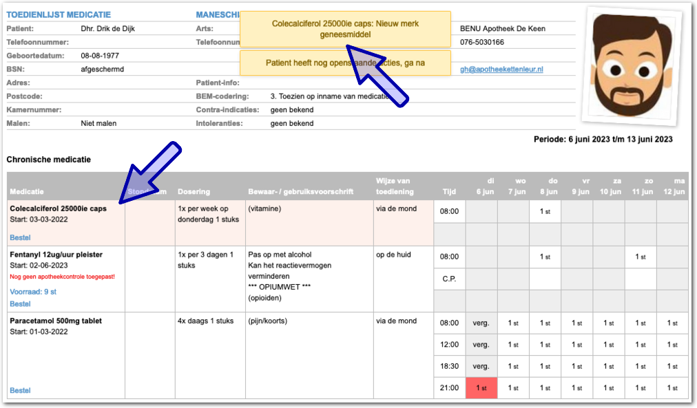 Gebruikers die medicatie aftekenen kunnen vooraf gedefinieerde 'Waarschuwingen' toevoegen aan een cliënt of geneesmiddel die de cliënt gebruikt. Hierdoor kan een gebruiker collega’s attenderen op zaken die er spelen bij de cliënt. Wanneer de toedienregistratie van de cliënt wordt geopend, dan toont Medimo deze waarschuwing. Onderstaande afbeelding is daarvan een voorbeeld. De blauwe pijlen in deze afbeelding wijzen naar de waarschuwing 'Nieuwe merk geneesmiddel' die gekoppeld is aan de Colecalciferol 25000ie caps.