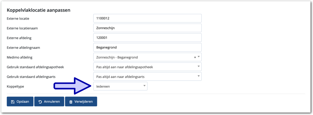 Deze waarde bepaalt hoe Medimo omgaat met de toewijzing van de desbetreffende afdeling. Het 'Koppeltype geeft u aan bij de details van een gekoppelde regel in de 'Koppelvlaktabel webservices'. Onderstaande afbeelding is een voorbeeld van de details van een gekoppelde regel. De blauwe pijl in onderstaande afbeelding wijst naar de parameter 'Koppeltype'.