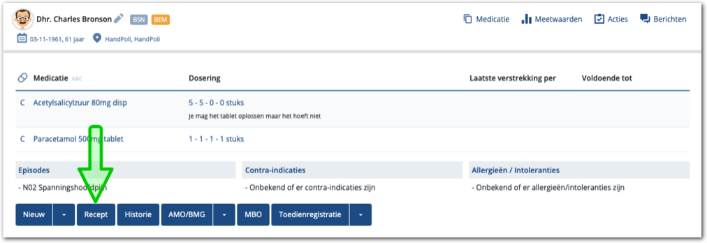 Vanuit Medimo kan naar een apotheek uit de landelijke tabel een recept worden verzonden. Deze functionaliteit is met name geschikt voor poliklinische locaties. Om nog sneller een dergelijk (poli)recept te maken wordt bij de poliklinische locaties de knop 'Recept' toegevoegd aan de status van de cliënt. Onderstaande afbeelding is een voorbeeld daarvan. Hierbij wijst de groene pijl naar de knop 'Recept'.