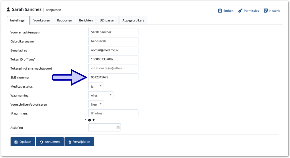 Gebruikers aangemaakt met een SMS-nummer kunnen met sms-code inloggen. Onderstaande afbeelding is voorbeeld van een account waaraan een sms-nummer is toegevoegd. De blauwe pijl wijst naar het veld voor het sms-nummer.